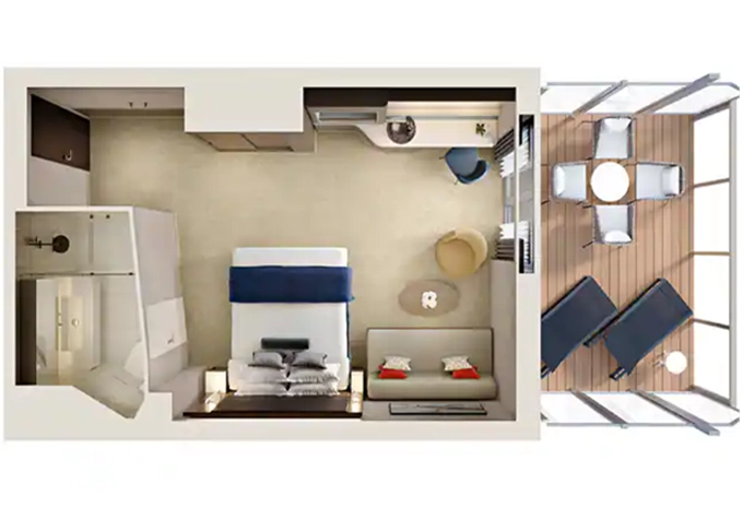 | B1 - Kajuta s veľkým balkónom Aft-facing 21 m² / balkón 8 m². 7. až 10. paluba - vzadu. Max 3 osoby. | 6 964 € 3 482 € za osobu | ||