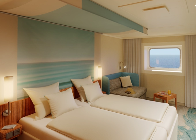 | CA - Vonkajšia kajuta PREMIUM / obmedzený výhľad 14-16,5 m². Neotvárateľné okno / obmedzený výhľad. 6. paluba. Max 2 osoby. Cenový model Premium. | 2 190 € 1 095 € za osobu |